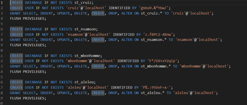 Afin d’industrialiser le déploiement, genererScriptSqlCreate.py produit automatiquement un script SQL permettant de créer les utilisateurs MariaDB, leurs bases dédiées et leurs privilèges associés.