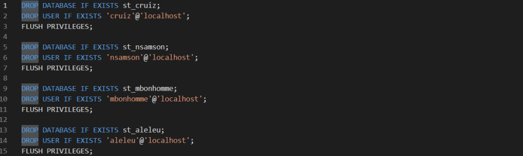 La gestion du cycle de vie ne s’arrête pas à la création. Le script genererScriptSqlDrop.py génère les instructions nécessaires pour supprimer proprement les utilisateurs et leurs bases associées. Cette étape garantit qu’aucun accès résiduel ne subsiste et complète l’approche d’automatisation industrielle.