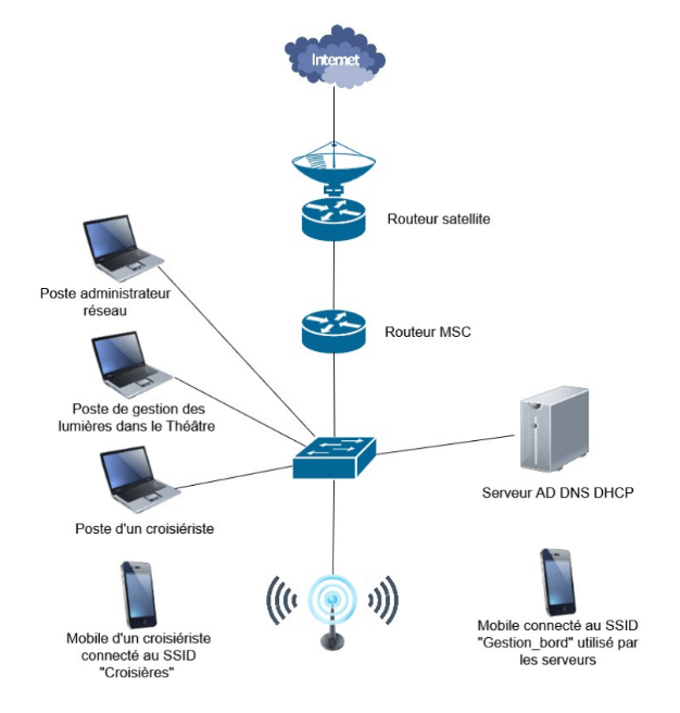 L’objectif de ce projet est de concevoir et déployer une infrastructure réseau sécurisée à bord d’un bateau de croisière, capable de répondre aux besoins distincts des passagers et de l’équipage. La solution repose sur la mise en place d’un réseau Wi-Fi segmenté via plusieurs SSID associés à des VLANs, garantissant l’isolation des usages et une meilleure gestion du trafic.