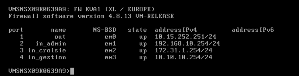 Ici nous visualisons nos 4 interfaces réseaux, nous avons les 3 passerelles de nos réseaux sur le LAN ainsi que l’interface de sortie vers Internet.