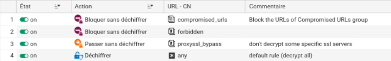 Le filtrage SSL n’est pas autorisé pour tous les sites conformément à la réglementation en vigueur, d’où la présence de l’objet « proxy SSL bypass ». Avec HTTPS, certains proxys font du « SSL inspection » en déchiffrant temporairement les données. Pour les sites bancaires par exemple cela brise le chiffrement de bout en bout et expose potentiellement des données sensibles. C’est donc interdit ou fortement encadré par la réglementation pour protéger la confidentialité et la sécurité des utilisateurs.